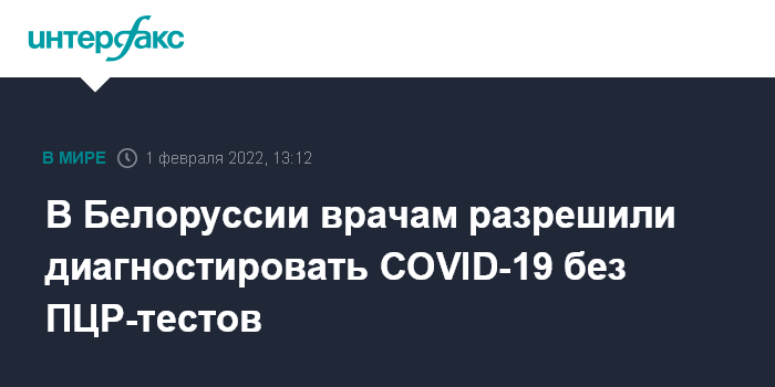Москва. 1 февраля. INTERFAX.RU - Минздрав Белоруссии разрешил врачам устанавливать диагноз COVID-19 без проведения пациентам ПЦР-тестирования или антиген-тестирования.