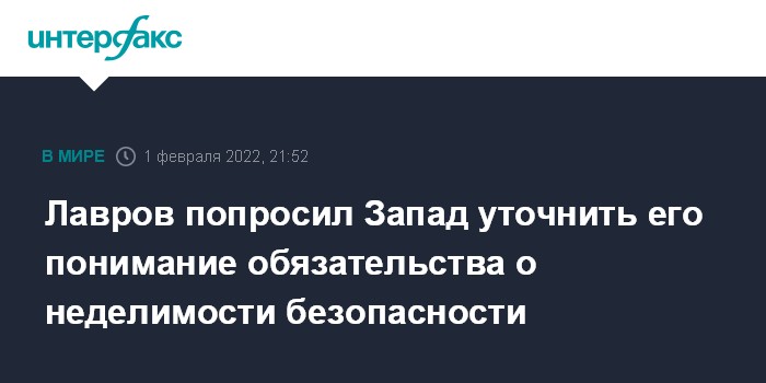 Москва. 1 февраля. INTERFAX.RU - В России хотят получить от стран Запада четкий ответ на вопрос о том, как они понимают свое обязательство о неделимости безопасности, и ожидают оперативной реакции США, Канады и ряда стран Европы на послание главы МИД РФ Лаврова по данной тематике.