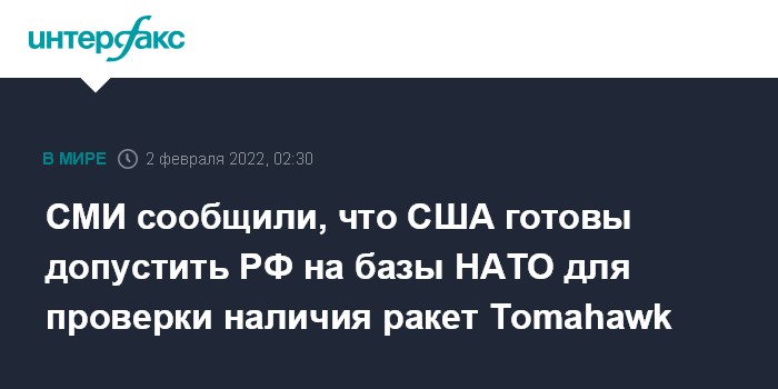 Москва. 2 февраля. INTERFAX.RU - США готовы рассмотреть предоставление России возможности убедиться, что на базах НАТО в Румынии и Польше нет крылатых ракет Tomahawk, сообщает Bloomberg.