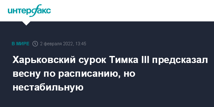 Москва. 2 февраля. INTERFAX.RU - Степной сурок Тимка III, который живет на биологической станции Харьковского национального университета имени Каразина в поселки Гайдары в Харьковской области, не увидел свою тень, когда его достали из его домика 2 февраля, передает корреспондент "Интерфакс".