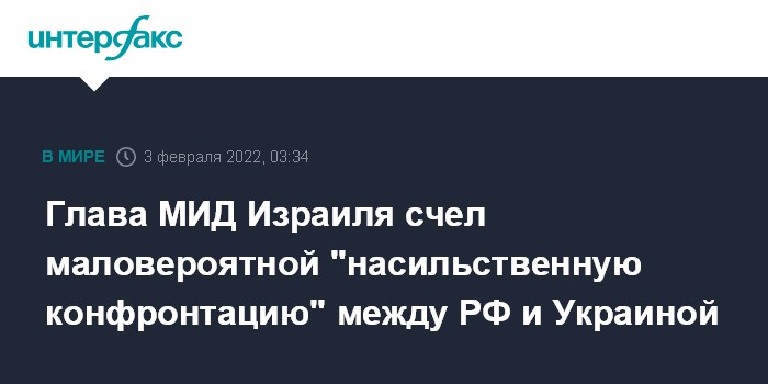 Москва. 3 февраля. INTERFAX.RU - Израиль не считает, что в ближайшее время конфронтация между Россией и Украиной может вылиться в вооруженный конфликт, заявил новостному порталу Axios министр иностранных дел Израиля Яир Лапид.