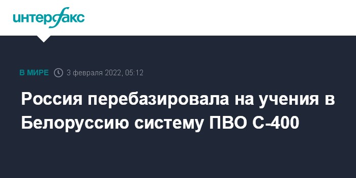 Москва. 3 февраля. INTERFAX.RU - Российская система противовоздушной обороны (ПВО) дальнего действия С-400 "Триумф" доставлена в рамках учений в Белоруссию и готовится заступить на боевое дежурство на полигоне под Брестом, сообщили в Минобороны РФ в четверг.