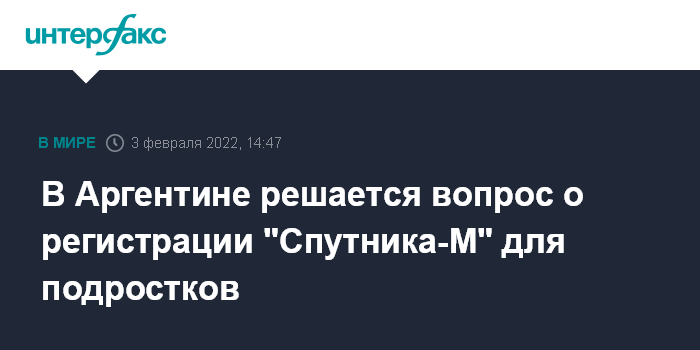 Москва. 3 февраля. INTERFAX.RU - Работа по регистрации вакцины для подростков "Спутника-М" в Аргентине продолжается, сообщил президент РФ Владимир Путин.