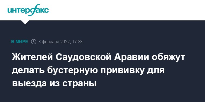 Москва. 3 февраля. INTERFAX.RU - Власти Саудовской Аравии обяжут жителей королевства с 9 февраля быть привитыми бустерной дозой вакцин против COVID-19, чтобы выезжать с какой-либо целью за пределы страны, сообщает в четверг телеканал Al Arabiya со ссылкой на саудовское МВД.