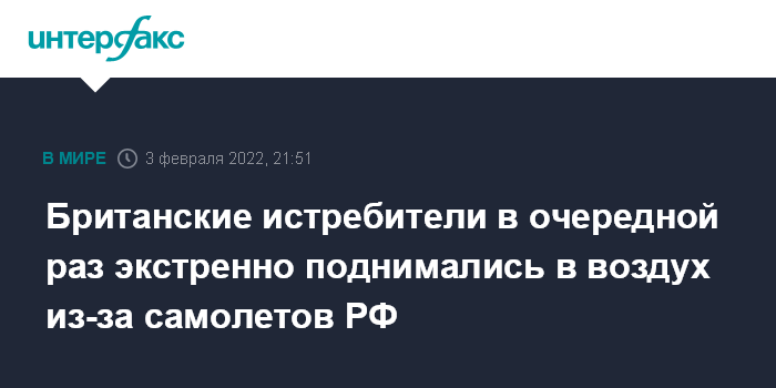Москва. 3 февраля. INTERFAX.RU - Два британских истребителя дежурных сил Typhoon ("Тайфун") в четверг экстренно поднимались в воздух с авиабазы Лоссимут в Шотландии для идентификации и сопровождения российских стратегических бомбардировщиков Ту-95, приближавшихся к Соединенному Королевству, сообщили Королевские ВВС.