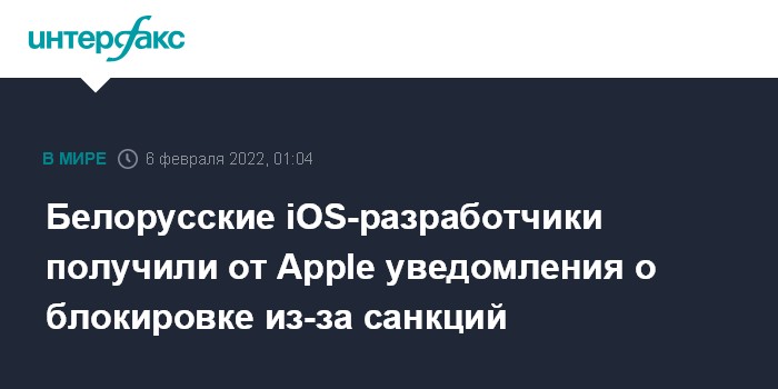 Москва. 6 февраля. INTERFAX.RU - Американская корпорация Apple отправила iOS-разработчикам с белорусской регистрацией письма с предупреждением о блокировке в связи с санкциями, сообщает портал Onliner.