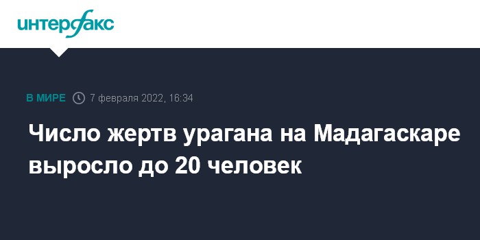 Москва. 7 февраля. INTERFAX.RU - Число жертв мощного урагана "Батсираи", ударившего по Мадагаскару, увеличилось до 20 человек, 55 тыс. жителей эвакуированы, сообщают в понедельник британские СМИ.