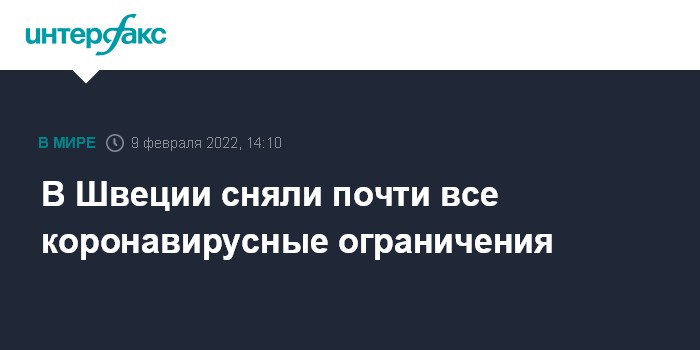 Москва. 9 февраля. INTERFAX.RU - Власти Швеции отменили вакцинные паспорта, ограничения на собрания людей в общественных местах и сокращенные рабочие часы в барах и кафе, передает в среду агентство Associated Press (AP).