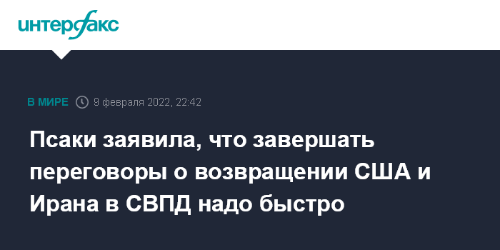 "Наши переговоры с Ираном достигли важнейшего момента в контексте возвращения обоих сторон к полной имплементации СВПД, соглашения, которое описывает ключевые моменты обеспокоенности обеих сторон. Но если оно не будет достигнуто в ближайшие недели, то движение Ирана в развитии ядерной программы сделает невозможным для нас вернуться к СВПД", - сказала Псаки.
