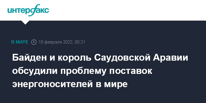 Москва. 10 февраля. INTERFAX.RU - Президент США Джо Байден и король Саудовской Аравии Салман ибн Абдул-Азиз Аль Сауд в ходе телефонного разговора обсудили необходимость поддержания стабильности поставок энергоресурсов в мире, сообщает Белый дом.