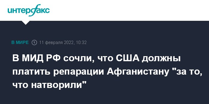 Москва. 11 февраля. INTERFAX.RU - Соединенные Штаты Америки должны платить Афганистану репарации "за то, что натворили", а не ставить афганскому руководству условия для разморозки зарубежных активов, заявил спецпредставитель президента РФ по Афганистану, директор второго департамента Азии МИД РФ Замир Кабулов.