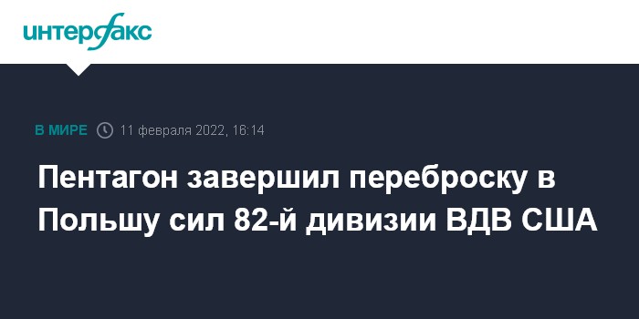 Москва. 11 февраля. INTERFAX.RU - Пентагон завершил переброску в Польшу подразделений 82-й воздушно-десантной дивизии, доставив туда с начала недели 1,7 тыс. военнослужащих бригадной боевой группы, сообщило Командование ВВС США в Европе.