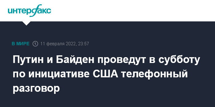 Москва. 11 февраля. INTERFAX.RU - Президенты России и США Владимир Путин и Джо Байден по инициативе американской стороны планируют провести телефонный разговор в субботу, 12 февраля, сообщил журналистам пресс-секретарь российского лидера Дмитрий Песков.