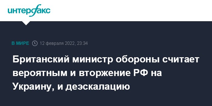 Москва. 12 февраля. INTERFAX.RU - Министр обороны Великобритании Бен Уоллес заявил, что считает вторжение России на Украину вероятным сценарием, но не исключает и движения в сторону деэскалации, пишет The Times.