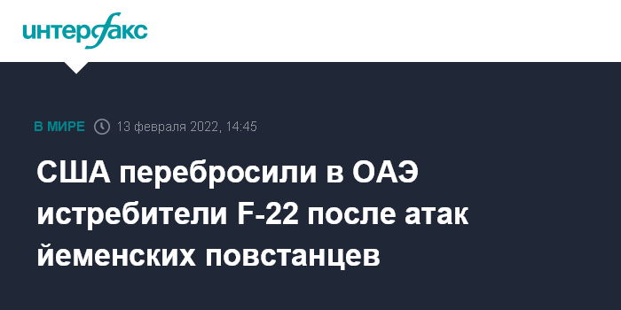 Москва. 13 февраля. INTERFAX.RU - Группа истребителей ВВС США F-22 прибыла накануне в ОАЭ после того, как йеменские повстанцы в январе провели ряд атак, угрожавших военным ОАЭ и США, сообщил телеканал "Аль-Арабийя".