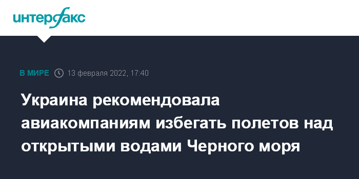 Москва. 13 февраля. INTERFAX.RU - Украина официально опубликовала аэронавигационную информацию об активации потенциально опасной зоны в воздушном пространстве над открытыми водами Черного моря с 14 по 19 февраля.