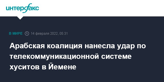 Москва. 14 февраля. INTERFAX.RU - Государственное Саудовское телевидение в понедельник сообщило, что арабская коалиция под руководством Саудовской Аравии уничтожила телекоммуникационную систему хуситов, используемую для управления беспилотниками.