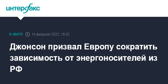 Москва. 14 февраля. INTERFAX.RU - Премьер-министр Великобритании Борис Джонсон в понедельник призвал европейские страны сократить зависимость от российских углеводородов и заняться поиском альтернативных источников энергии, передают британские СМИ.