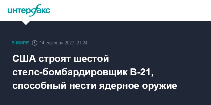 Москва. 14 февраля. INTERFAX.RU - В Соединенных Штатах приступили к сборке шестого новейшего стратегического бомбардировщика B-21 Raider, способного нести ядерное оружие, в текущем году уже начнутся первые летные испытания самолетов этого типа, следует из данных Командования глобального удара американских ВВС.