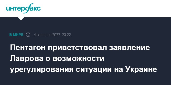 Москва. 14 февраля. INTERFAX.RU - Вашингтон приветствует заявления главы МИД России Сергея Лаврова о том, что Москва верит в возможность урегулирования ситуации на Украине дипломатическим путем, заявил в понедельник представитель Пентагона Джон Кирби.