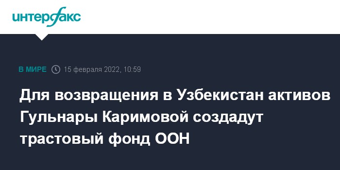 Москва. 15 февраля. INTERFAX.RU - Для возвращения в Узбекистан активов старшей дочери бывшего президента Ислама Каримова Гульнары Каримовой будет создан многосторонний трастовый фонд. Принципиальная договоренность об этом достигнута 11 февраля на переговорах Швейцарии и Узбекистана, сообщила пресс-секретарь Минюста Севара Уринбаева.