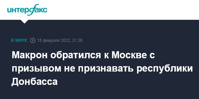 Москва. 15 февраля. INTERFAX.RU - Президент Франции Эммануэль Макрон призвал российское руководство не признавать самопровозглашенные Донецкую и Луганскую народные республики (ДНР и ЛНР).