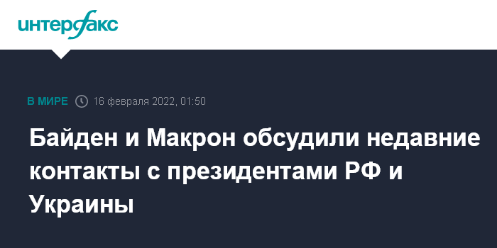 Москва. 16 февраля. INTERFAX.RU - Президенты США и Франции Джо Байден и Эммануэль Макрон в ходе телефонного разговора обменялись мнениями касательно их недавних контактов с лидерами России и Украины Владимиром Путиным и Владимиром Зеленским, сообщается на сайте Белого дома.