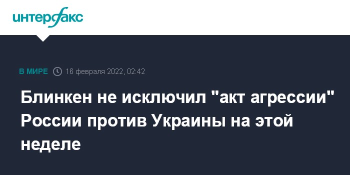Москва. 16 февраля. INTERFAX.RU - Госсекретарь США Энтони Блинкен заявил, что "акт агрессии" со стороны России по отношению к Украине, возможно, произойдет на этой неделе.