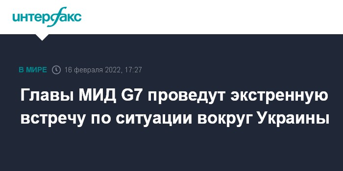 Москва. 16 февраля. INTERFAX.RU - Главы МИД стран G7 рассчитывают в ближайшие выходные провести в ФРГ экстренную встречу по ситуации вокруг Украины, чтобы подтвердить единую позицию "Большой семерки" по этой проблеме, сообщило агентство Kyodo со ссылкой на источники.