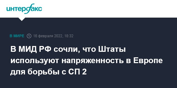 Москва. 16 февраля. INTERFAX.RU - Соединенные Штаты нагнетают напряженность в Европе, чтобы использовать ее в качестве предлога для усиления ограничений на поставки российского газа, заявила официальный представитель МИД РФ Мария Захарова; по ее словам, США пытаются помешать реализации проекта "Северный поток 2".