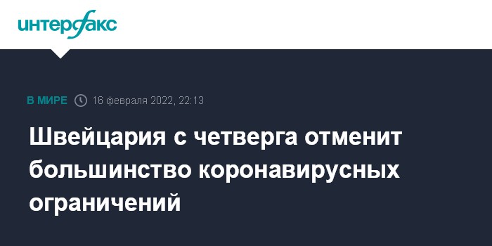 Москва. 16 февраля. INTERFAX.RU - Федеральный совет (правительство) Швейцарии принял решение об отмене с 17 февраля большинства ограничений, введенных в связи с распространением коронавирусной инфекции, сообщается в среду на сайте кабинета министров страны.