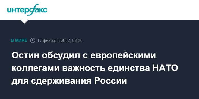 Москва. 17 февраля. INTERFAX.RU - Министр обороны США Ллойд Остин и его коллеги из Франции Флоранс Парли, Германии Кристина Ламбрехт и Великобритании Бен Уоллес во время встречи в Брюсселе подтвердили важность единства НАТО для противодействия политике России, сообщил пресс-секретарь Пентагона Джон Кирби.