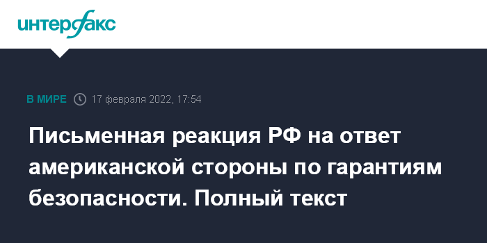 Письменная реакция РФ на ответ американской стороны по гарантиям безопасности. Полный текст