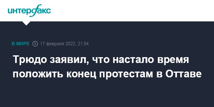 Москва. 17 февраля. INTERFAX.RU - Премьер-министр Канады Джастин Трюдо объявил в парламенте, что пришло время пресечь протесты против мер властей по COVID-19, продолжающиеся почти три недели в канадской столице Оттаве.
