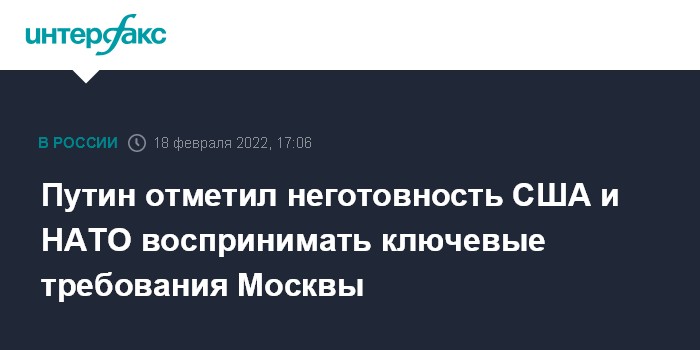 "Как уже говорил ранее, США и другие члены альянса пока не настроены, к сожалению, адекватно воспринимать эти три стержневых элемента нашей инициативы. В то же время ими сформулирован ряд идей по вопросам европейской безопасности, ракет средней и меньшей дальности, военной транспарентности, которые Россия не против обсуждать", - сказал Путин 18 февраля.