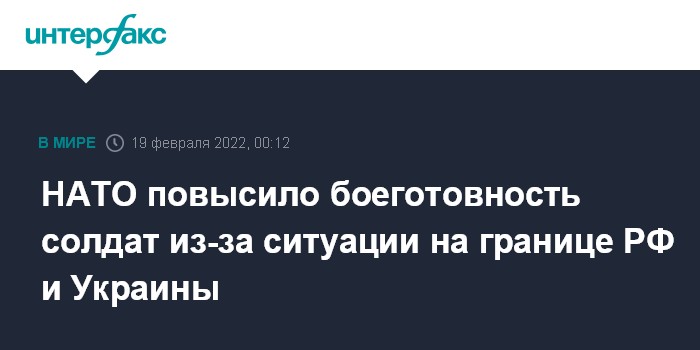 Москва. 19 февраля. INTERFAX.RU - Североатлантический альянс повышает боеготовность солдат из-за опасений конфликта в зоне российско-украинской границы. По информации немецкого информагентства dpa, силы группы быстрого реагирования NFR впредь должны быть готовы к передислокации не в течение 30 дней, а за неделю.
