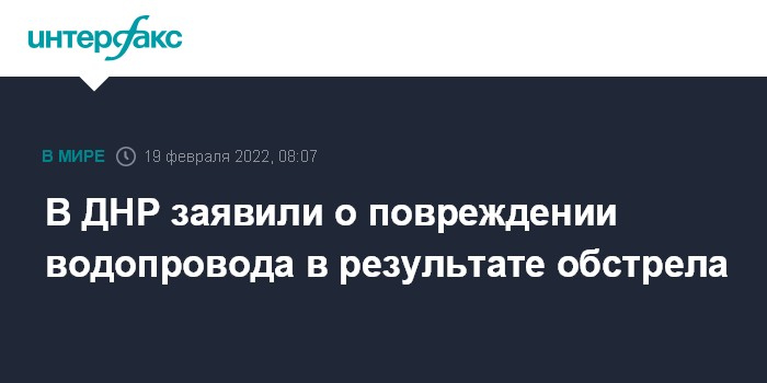 Москва. 19 февраля. INTERFAX.RU - В результате обстрела поврежден Южно-Донбасский водовод, без воды могут остаться города и поселки по сторонам линии разграничения, сообщает в субботу глава администрации Докучаевска самопровозглашенной Донецкой народной республики (ДНР) Александр Качанов.