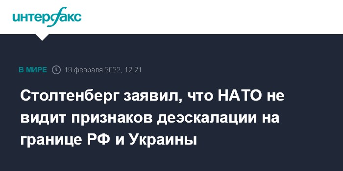 Москва. 19 февраля. INTERFAX.RU - НАТО по-прежнему не видит признаков отвода войск РФ от границы с Украиной и считает реальным риск конфликта между Москвой и Киевом, заявил в субботу генеральный секретарь альянса Йенс Столтенберг.
