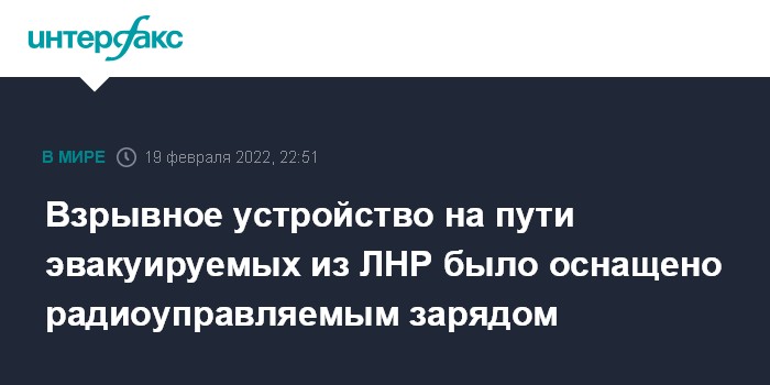 Москва. 19 февраля. INTERFAX.RU - Взрывное устройство, обнаруженное в субботу в автомобиле на трассе по пути следования автобусов с эвакуируемыми в Россию жителями самопровозглашенной Луганской народной республики (ЛНР), было оснащено радиоуправляемым зарядом, сообщили в министерстве государственной безопасности ЛНР.