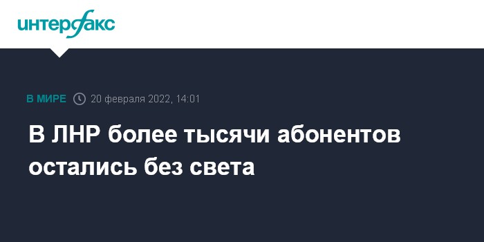 Москва. 20 февраля. INTERFAX.RU - В Луганске сообщают, что более тысячи абонентов в подконтрольных самопровозглашенной Луганской народной республике поселках Голубовское и Донецкий остались без электричества в результате обстрелов в воскресенье.