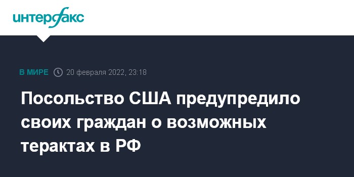Москва. 20 февраля. INTERFAX.RU - Посольство США в России опубликовало предупреждение для американских граждан, проживающих в России, подумать о плане по выезду из страны из-за возможности терактов в общественных местах. Об этом сообщается на официальном сайте диппредставительства.