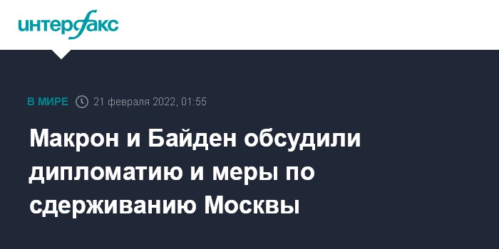 Москва. 21 февраля. INTERFAX.RU - Президенты США и Франции Джо Байден и Эммануэль Макрон обсудили вопрос дипломатического решения проблем с РФ, а также - меры по сдерживанию Москвы, говорится в сообщении Белого дома.