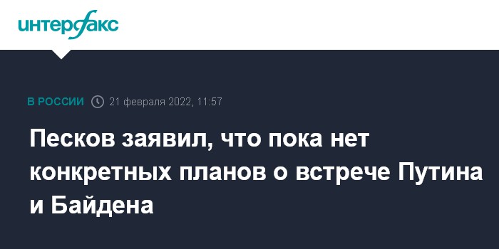 По его словам, конкретных планов на этот счет у Кремля пока нет. В данный момент только планируются переговоры главы МИД Сергея Лаврова с госсекретарем США Энтони Блинкеном. Ранее сообщалось, что они могут встретиться в Европе 24 февраля.