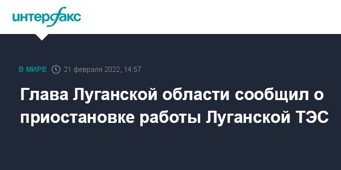 Москва. 21 февраля. INTERFAX.RU - Глава Луганской областной государственной администрации Сергей Гайдай сообщил о приостановке работы Луганской теплоэлектростанции в городе Счастье Луганской области вследствие повреждения всех отходящих от нее линий электропередач.