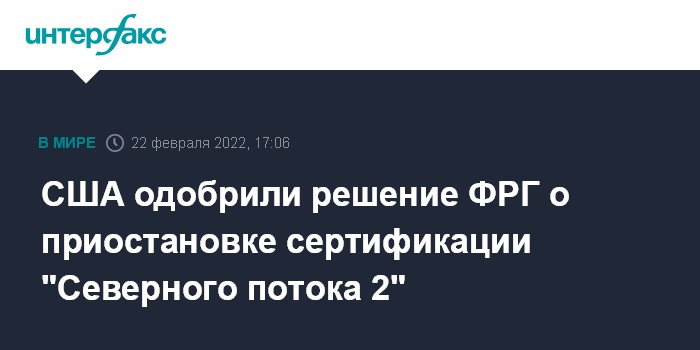 Москва. 22 февраля. INTERFAX.RU - США приветствуют решение властей ФРГ приостановить сертификацию газопровода "Северный поток 2" на фоне признания Россией независимости Донецкой и Луганской народных республик (ДНР и ЛНР), заявила пресс-секретарь Белого дома Джен Псаки.