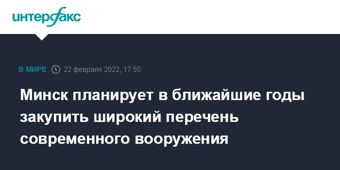 Москва. 22 февраля. INTERFAX.RU - Власти Белоруссии намерены в ближайшей перспективе закупить широкий спектр современного вооружения, включая самолеты Су-30СМ, вертолеты, зенитные ракетные комплексы "Тор-М2", заявил президент республики Александр Лукашенко на собрании, посвященном Дню защитников Отечества и Вооруженных сил во вторник в Минске.