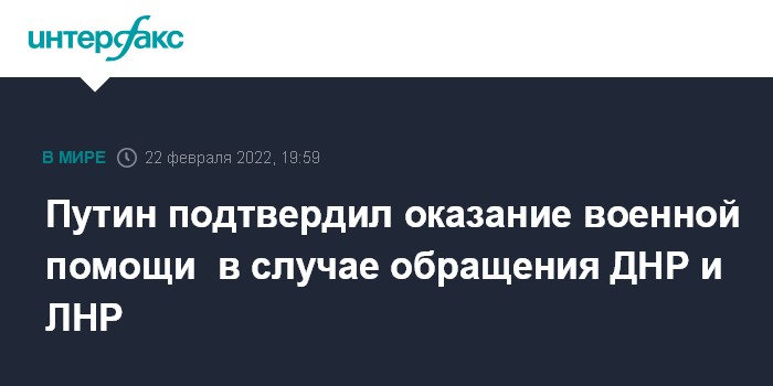 Москва. 22 февраля. INTERFAX.RU - Россия будет исполнять взятые на себя обязательства по военной помощи ДНР и ЛНР, сообщил президент РФ Владимир Путин во вторник.