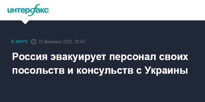 Москва. 22 февраля. INTERFAX.RU - Руководство России приняло решение об эвакуации сотрудников загранучреждений на Украине, эвакуация будет осуществлена в ближайшее время, сообщил МИД России.