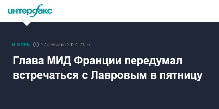 Москва. 22 февраля. INTERFAX.RU - Глава МИД Франции Жан-Ив Ле Дриан во вторник заявил, что встреча с главой МИД РФ Сергеем Лавровым, планировавшаяся на пятницу, не состоится.