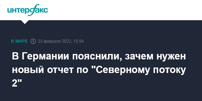 Москва. 23 февраля. INTERFAX.RU - Минэкономики ФРГ выдаст новый отчет по "Северному потоку 2", перепроверка срочно необходима из-за изменения правовой и политической ситуации, сообщила представитель министерства Беате Барон.